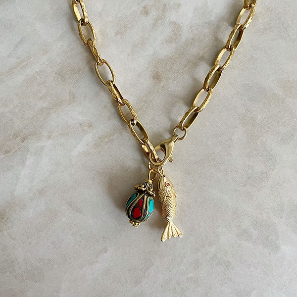 Lange stainless steel schakelketting met een visje en Tibetaanse kraal. Een ideale basic die je goed kunt layeren met andere kettingen. De bedels zitten vast aan het uiteinde van de ketting.