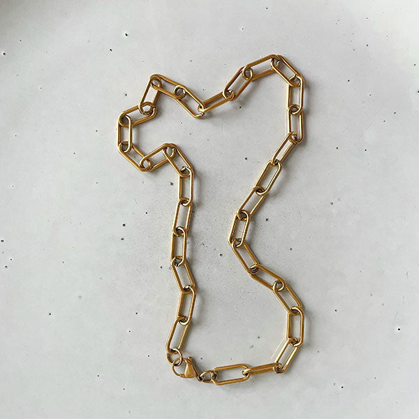 Gouden paperclipketting van stainless steel. Een ideale basic die je goed kunt layeren met andere kettingen. Je kunt de ketting met of zonder bedel dragen en de sluiting staat zowel voor als achter mooi.