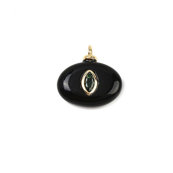 Deze ovale zwarte onyx bedel hang je makkelijk aan een koord ketting of schakelketting. Het zirconia steentje in het midden maakt het helemaal af.