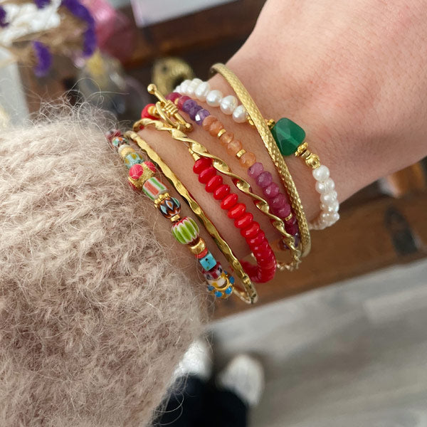Fijn geregen armbandje met bamboekoraal rode schijfjes. Een tijdloze eyecatcher.
