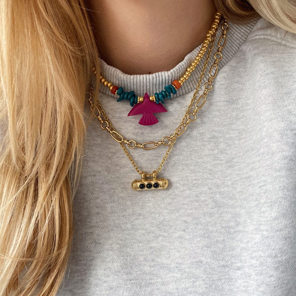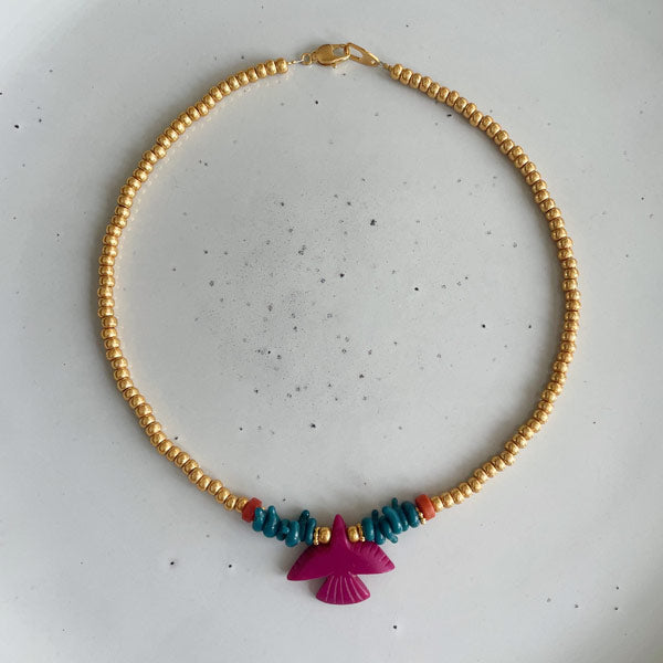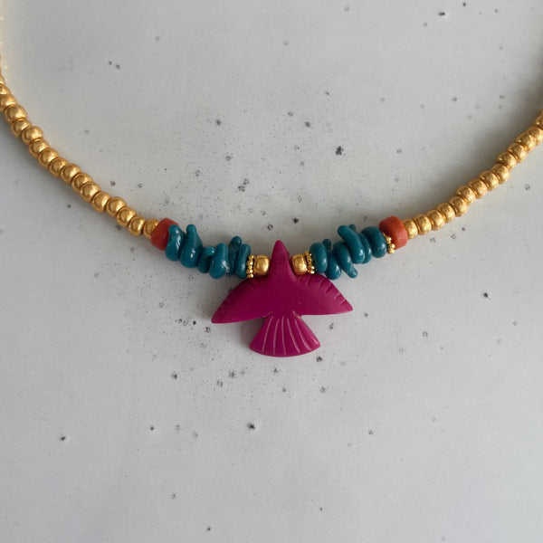 Deze ketting is geregen met gouden kralen en roze vogel in het midden. Door de warme kleuren combineert de ketting perfect met de sieradentrends van dit seizoen.