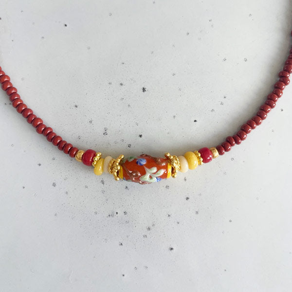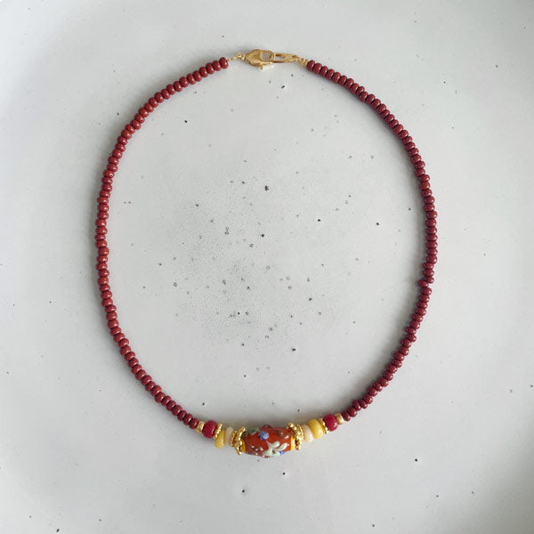 Deze ketting is geregen met burgundy bruine kralen en een ovale flower kraal in het midden. De kleur van dit seizoen en daardoor ideaal te combineren met de trends van 2026.