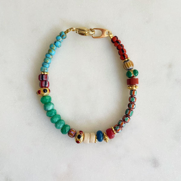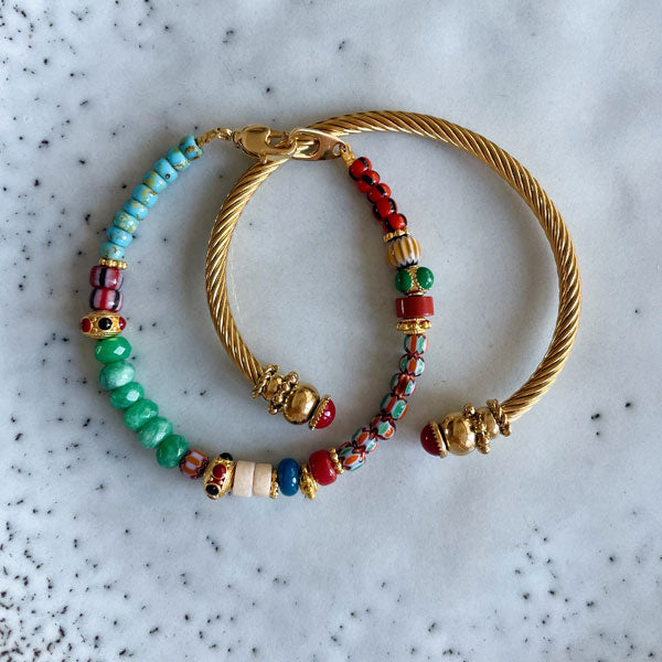A warm-colored bracelet, perfect for this season. Green, brown, and blue with gold bohemian beads. A perfect bracelet if you love color. Beautiful in combination with the red gemstone bangle .