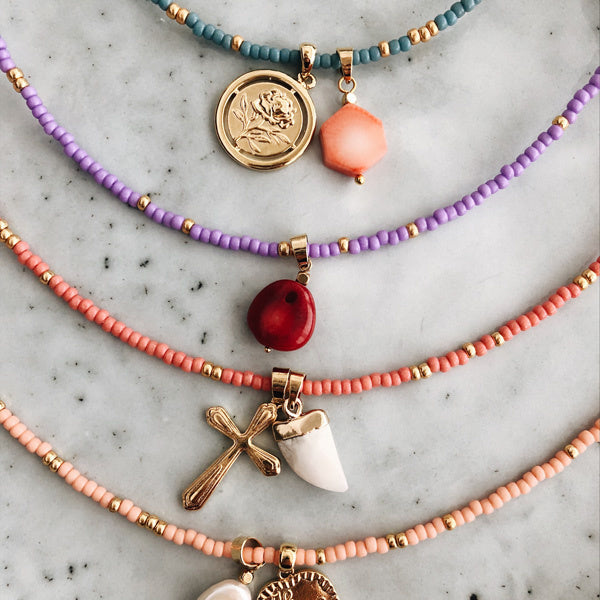 This basic necklace made of lilac Miyuki rocailles with gold-plated clasp is adjustable from 39 to 44 cm. What's really handy: you can easily slide our charms with the big eye over them! This way you can wear the necklace that matches your outfit every day.