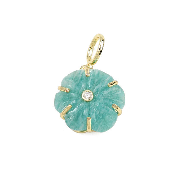 Deze groene amazoniet bedel in de vorm van een bloem hang je makkelijk aan een koord ketting of schakelketting.