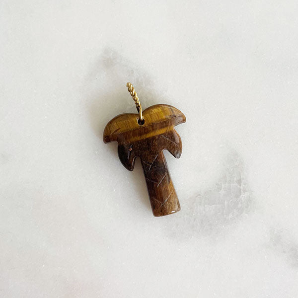 Deze bruine tijgeroog bedel in de vorm van een palmboom hang je makkelijk aan een koord ketting of schakelketting.