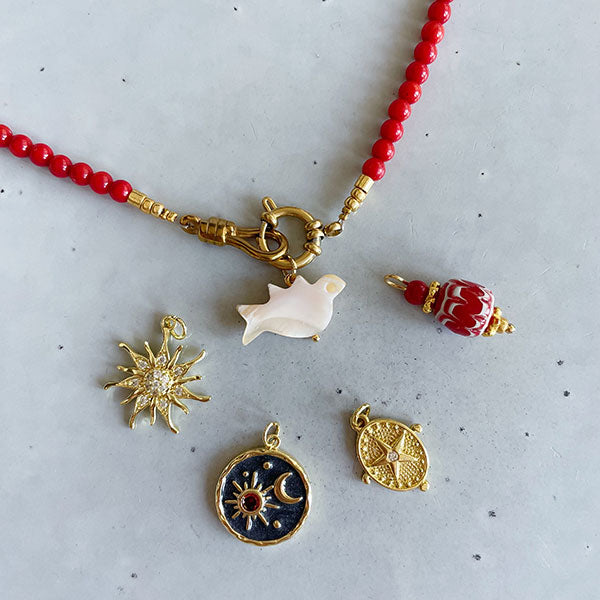 Deze ketting is geregen van rode bamboe koraal kralen en is te bestellen met of zonder bedels. Kies je een ketting met bedel? Dan kun je deze er makkelijk af en aan doen door het handige luxe haakje.