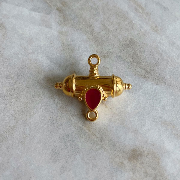 Bedel van een gouden tube connector met roze emaille. Een opvallende bedel die je bv aan een ketting van gekleurd koord kunt hangen. Deze kun je afhechten met een smart bead stopper voor koord. Zo is je ketting verstelbaar en heb je altijd de juiste lengte.