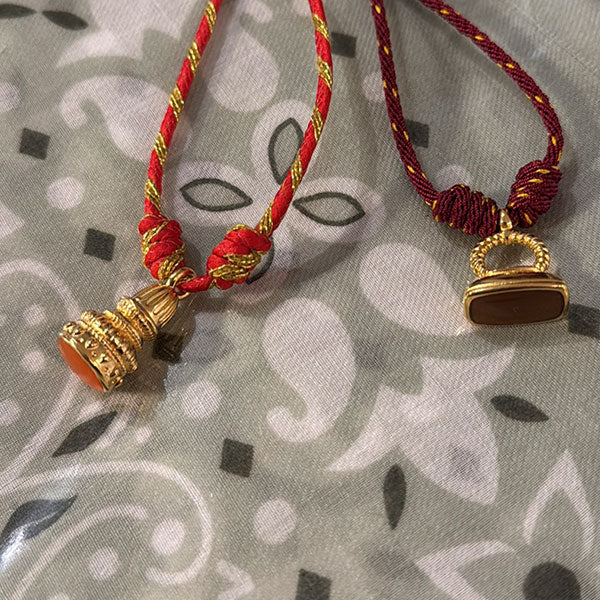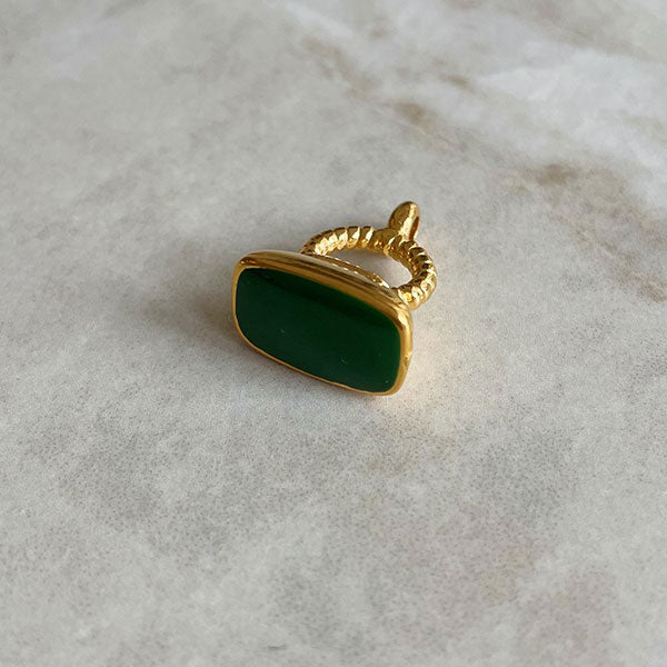 Bedel van een gouden zegelring met groene emaille. Een opvallende bedel die je bv aan een ketting van gekleurd koord kunt hangen. Deze kun je afhechten met een smart bead stopper voor koord. Zo is je ketting verstelbaar en heb je altijd de juiste lengte.
