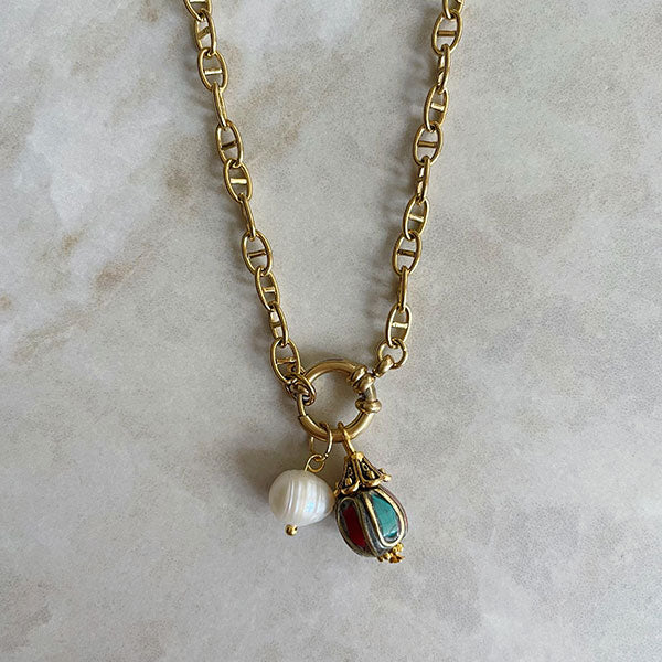 Lange stainless steel schakelketting met een Tibetaanse kraal en een zoetwaterparel. Een ideale basic die je goed kunt layeren met andere kettingen. Je kunt de ketting met of zonder bedels dragen en de sluiting staat zowel voor als achter mooi.